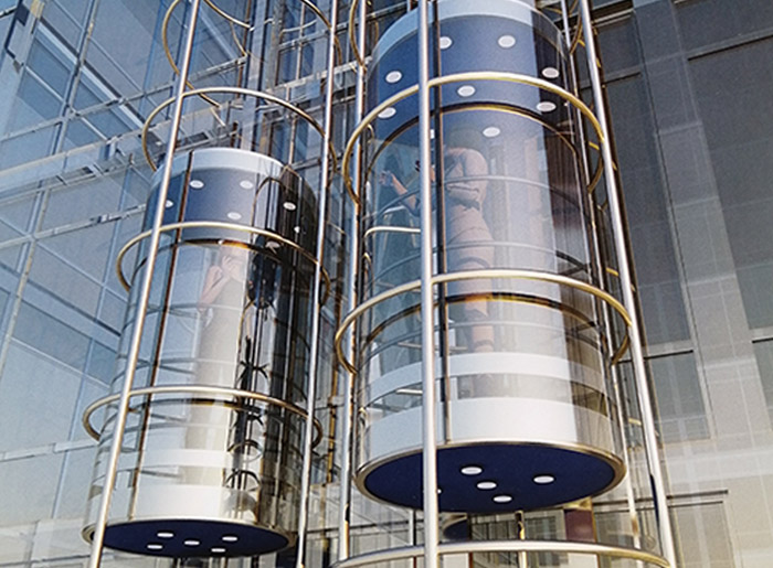 觀光電梯一種以電動機為動力的垂直升降機,裝有箱狀吊艙,用于多層建筑乘人或載運貨物。有一面或幾面的井道壁和轎廂壁是透明材料,乘客在乘坐電梯時,可以觀看轎廂外的景物。井道和轎廂壁至少有同一側(cè)透明,乘客可觀看轎廂外景物的電梯。主要安裝于賓館、商場、高層辦公樓場合,有一面或幾面的井道壁和轎廂壁同側(cè)是透明材料,乘客在乘坐電梯時,可以觀看轎廂外的景物。